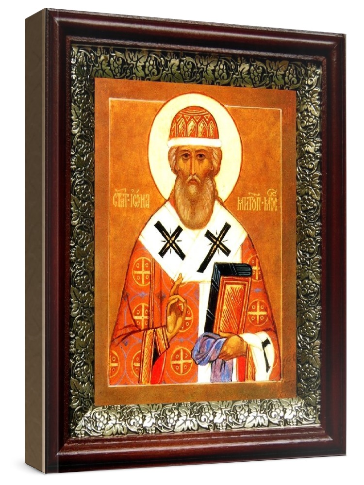 Икона иона московский (19х22), темный киот. Лик нанесен методом шелкографии на цельную липовую доску, покрытую левкасом (специальным грунтом под живопись). Использованы минеральные (природные) краски. Размер иконы без киота (см): 13х16, с киотом: 19х22. Киот со стеклом, выполнен из березы и украшен басмой (узор из черненой меди в виде виноградной лозы). Икона освящена.