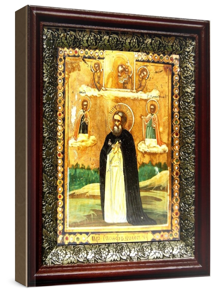 Икона иосиф вологодский (19х22), темный киот. Лик нанесен методом шелкографии на цельную липовую доску, покрытую левкасом (специальным грунтом под живопись). Использованы минеральные (природные) краски. Размер иконы без киота (см): 13х16, с киотом: 19х22. Киот со стеклом, выполнен из березы и украшен басмой (узор из черненой меди в виде виноградной лозы). Икона освящена.