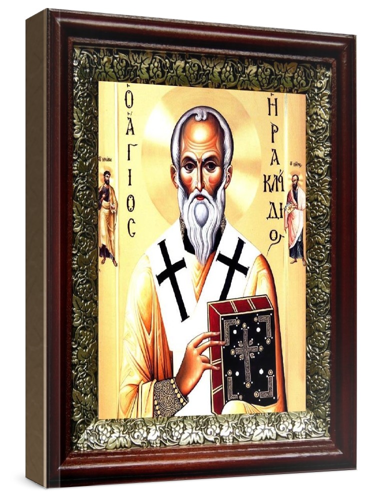 Икона ираклид тамасский (19х22), темный киот. Лик нанесен методом шелкографии на цельную липовую доску, покрытую левкасом (специальным грунтом под живопись). Использованы минеральные (природные) краски. Размер иконы без киота (см): 13х16, с киотом: 19х22. Киот со стеклом, выполнен из березы и украшен басмой (узор из черненой меди в виде виноградной лозы). Икона освящена.