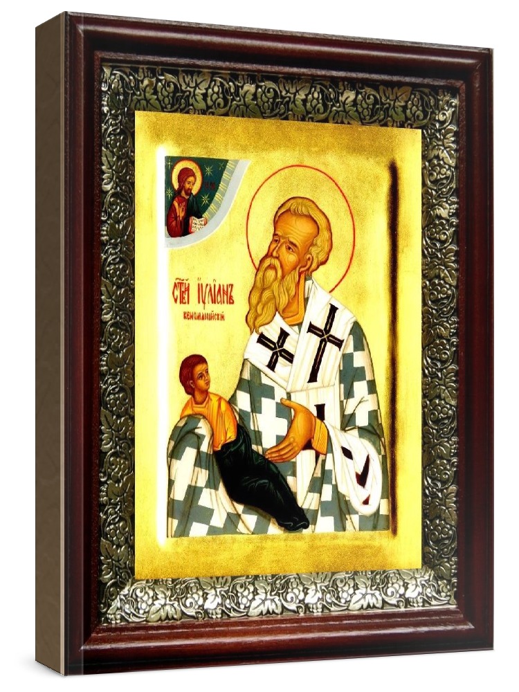 Икона иулиан кеноманийский (19х22), темный киот. Лик нанесен методом шелкографии на цельную липовую доску, покрытую левкасом (специальным грунтом под живопись). Использованы минеральные (природные) краски. Размер иконы без киота (см): 13х16, с киотом: 19х22. Киот со стеклом, выполнен из березы и украшен басмой (узор из черненой меди в виде виноградной лозы). Икона освящена.