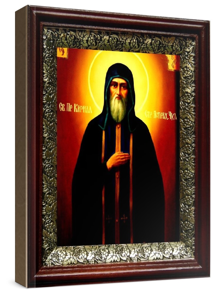 Икона кирилл астраханский (19х22), темный киот. Лик нанесен методом шелкографии на цельную липовую доску, покрытую левкасом (специальным грунтом под живопись). Использованы минеральные (природные) краски. Размер иконы без киота (см): 13х16, с киотом: 19х22. Киот со стеклом, выполнен из березы и украшен басмой (узор из черненой меди в виде виноградной лозы). Икона освящена.