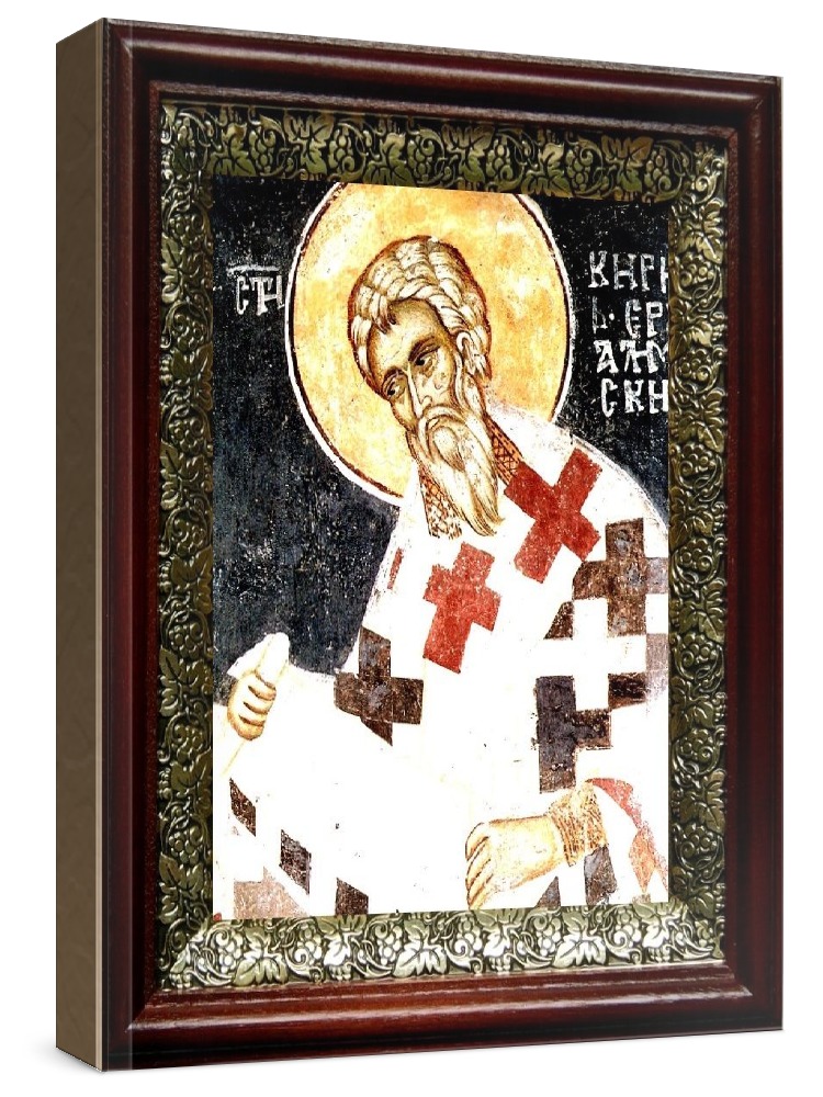 Икона кирилл иерусалимский (19х22), темный киот.     Лик нанесен методом шелкографии на цельную липовую доску, покрытую левкасом (специальным грунтом под живопись). Использованы минеральные (природные) краски.  Размер иконы без киота (см): 13х16, с киотом: 19х22.  Киот со стеклом, выполнен из березы и украшен басмой (узор из черненой меди в виде виноградной лозы).  Икона освящена.