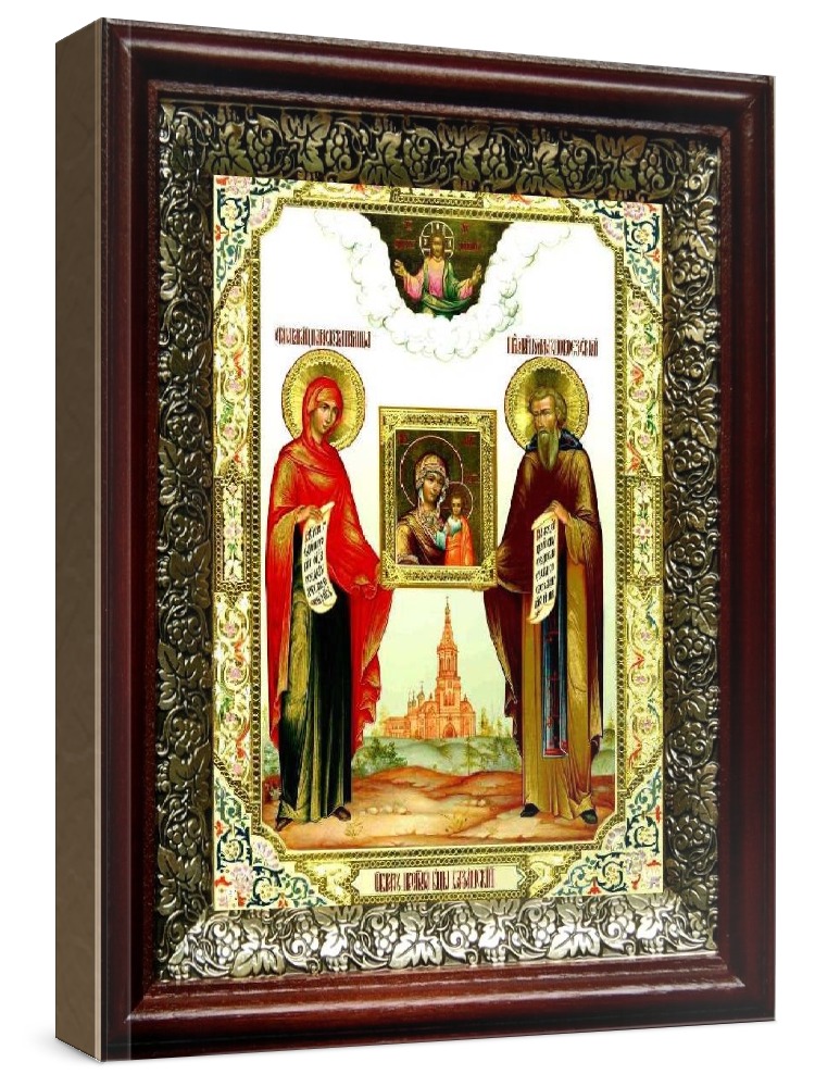 Икона кирилл новоезерский и параскева пятница (19х22), темный киот. Лик нанесен методом шелкографии на цельную липовую доску, покрытую левкасом (специальным грунтом под живопись). Использованы минеральные (природные) краски. Размер иконы без киота (см): 13х16, с киотом: 19х22. Киот со стеклом, выполнен из березы и украшен басмой (узор из черненой меди в виде виноградной лозы). Икона освящена.