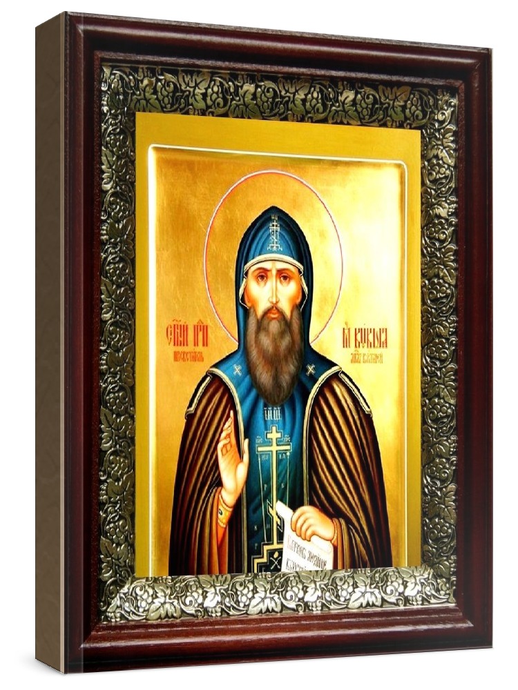 Икона кукша печерский (19х22), темный киот. Лик нанесен методом шелкографии на цельную липовую доску, покрытую левкасом (специальным грунтом под живопись). Использованы минеральные (природные) краски. Размер иконы без киота (см): 13х16, с киотом: 19х22. Киот со стеклом, выполнен из березы и украшен басмой (узор из черненой меди в виде виноградной лозы). Икона освящена.