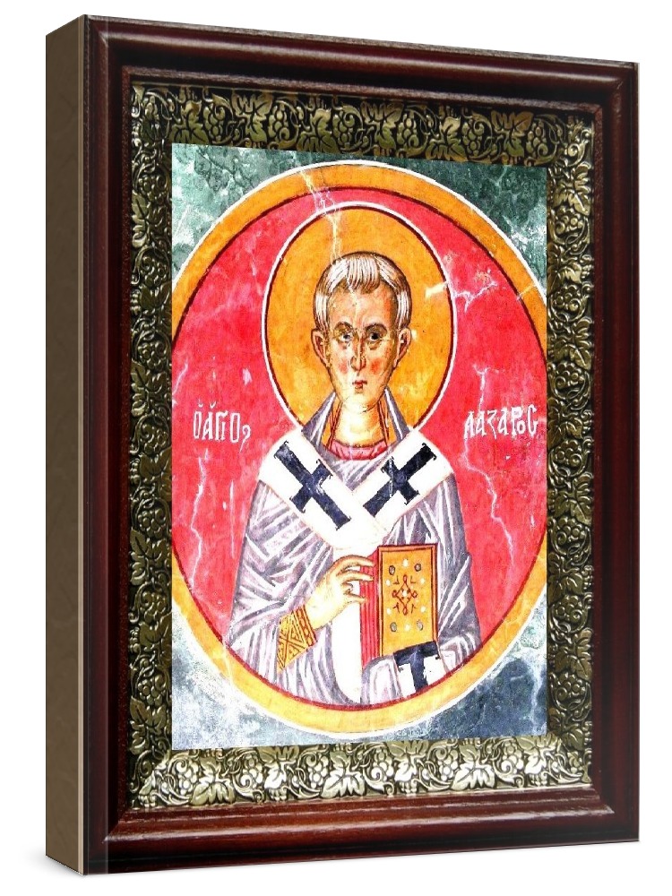 Икона лазарь четверодневный (19х22), темный киот. Лик нанесен методом шелкографии на цельную липовую доску, покрытую левкасом (специальным грунтом под живопись). Использованы минеральные (природные) краски. Размер иконы без киота (см): 13х16, с киотом: 19х22. Киот со стеклом, выполнен из березы и украшен басмой (узор из черненой меди в виде виноградной лозы). Икона освящена.