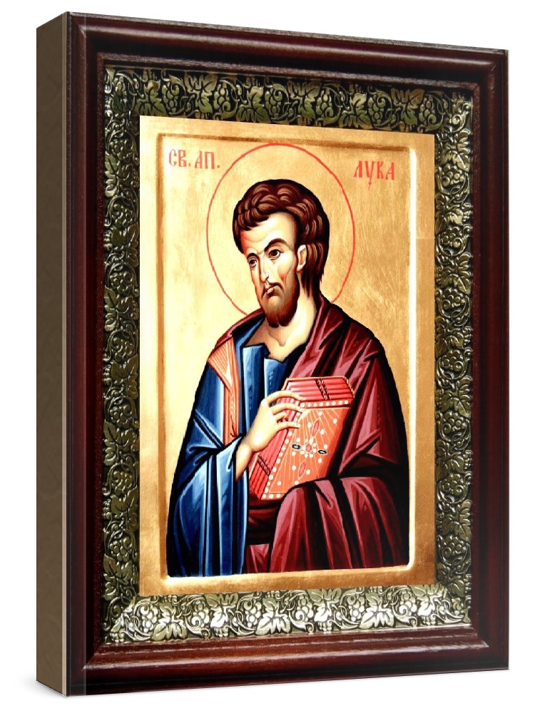Икона лука, апостол (19х22), темный киот. Лик нанесен методом шелкографии на цельную липовую доску, покрытую левкасом (специальным грунтом под живопись). Использованы минеральные (природные) краски. Размер иконы без киота (см): 13х16, с киотом: 19х22. Киот со стеклом, выполнен из березы и украшен басмой (узор из черненой меди в виде виноградной лозы). Икона освящена.