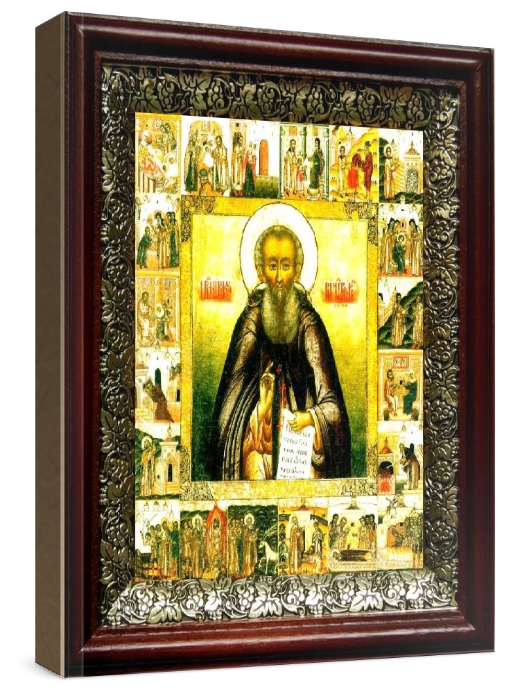 Икона макарий желтоводский (19х22), темный киот. Лик нанесен методом шелкографии на цельную липовую доску, покрытую левкасом (специальным грунтом под живопись). Использованы минеральные (природные) краски. Размер иконы без киота (см): 13х16, с киотом: 19х22. Киот со стеклом, выполнен из березы и украшен басмой (узор из черненой меди в виде виноградной лозы). Икона освящена.