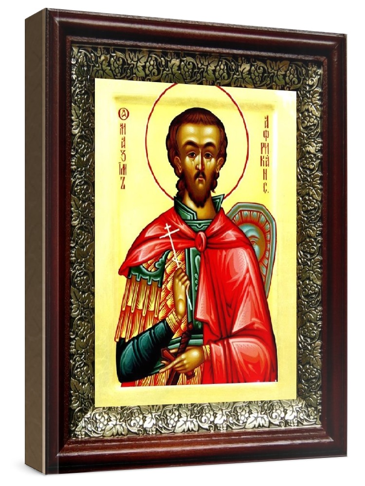 Икона максим африканский (19х22), темный киот. Лик нанесен методом шелкографии на цельную липовую доску, покрытую левкасом (специальным грунтом под живопись). Использованы минеральные (природные) краски. Размер иконы без киота (см): 13х16, с киотом: 19х22. Киот со стеклом, выполнен из березы и украшен басмой (узор из черненой меди в виде виноградной лозы). Икона освящена.