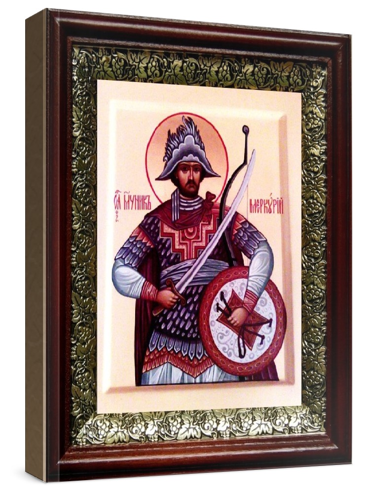 Икона меркурий смоленский (19х22), темный киот. Лик нанесен методом шелкографии на цельную липовую доску, покрытую левкасом (специальным грунтом под живопись). Использованы минеральные (природные) краски. Размер иконы без киота (см): 13х16, с киотом: 19х22. Киот со стеклом, выполнен из березы и украшен басмой (узор из черненой меди в виде виноградной лозы). Икона освящена.