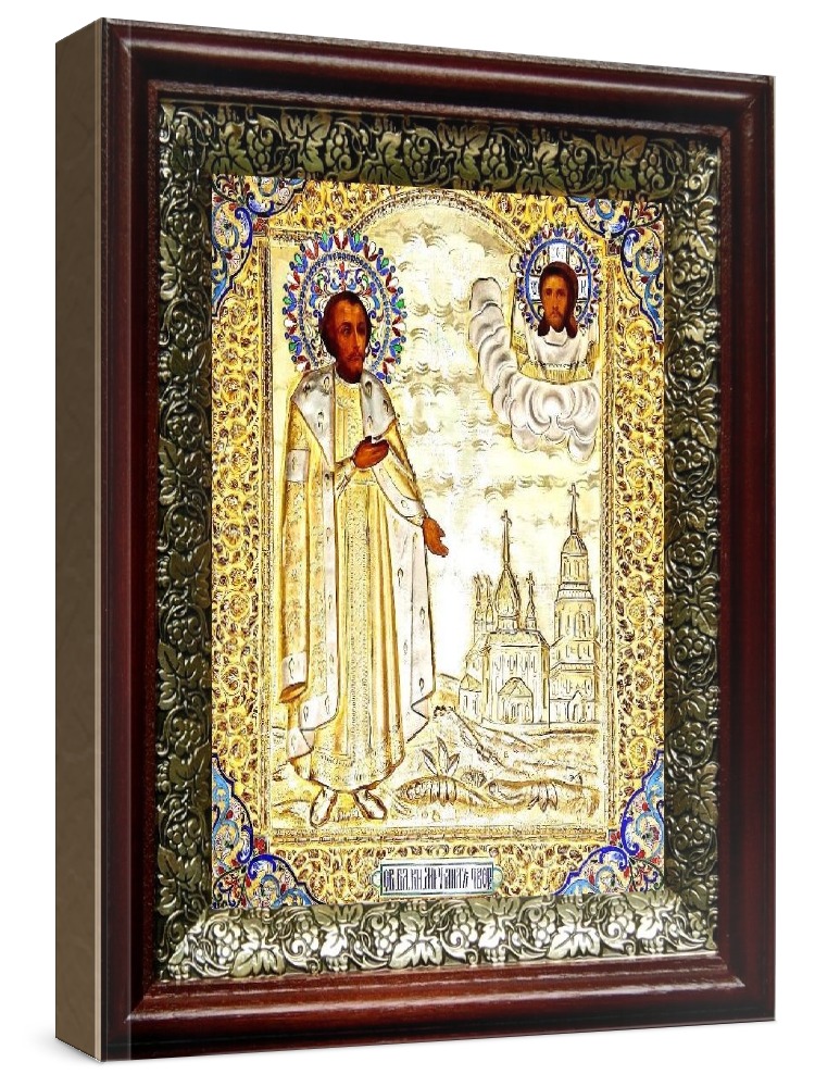 Икона михаил тверской (19х22), темный киот. Лик нанесен методом шелкографии на цельную липовую доску, покрытую левкасом (специальным грунтом под живопись). Использованы минеральные (природные) краски. Размер иконы без киота (см): 13х16, с киотом: 19х22. Киот со стеклом, выполнен из березы и украшен басмой (узор из черненой меди в виде виноградной лозы). Икона освящена.