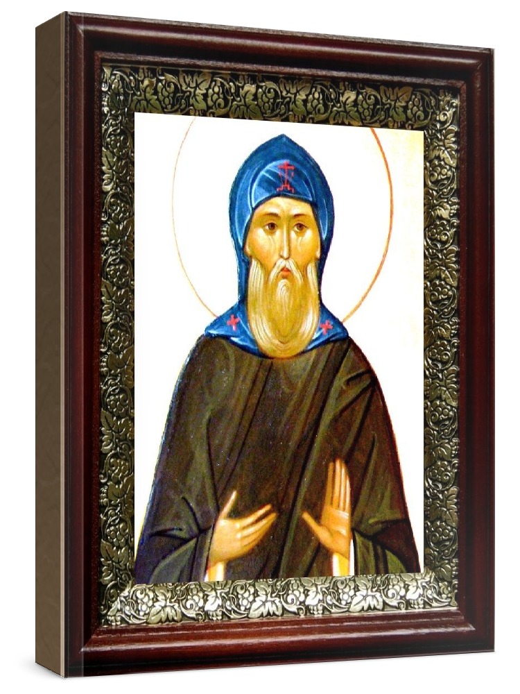 Икона михей радонежский (19х22), темный киот. Лик нанесен методом шелкографии на цельную липовую доску, покрытую левкасом (специальным грунтом под живопись). Использованы минеральные (природные) краски. Размер иконы без киота (см): 13х16, с киотом: 19х22. Киот со стеклом, выполнен из березы и украшен басмой (узор из черненой меди в виде виноградной лозы). Икона освящена.