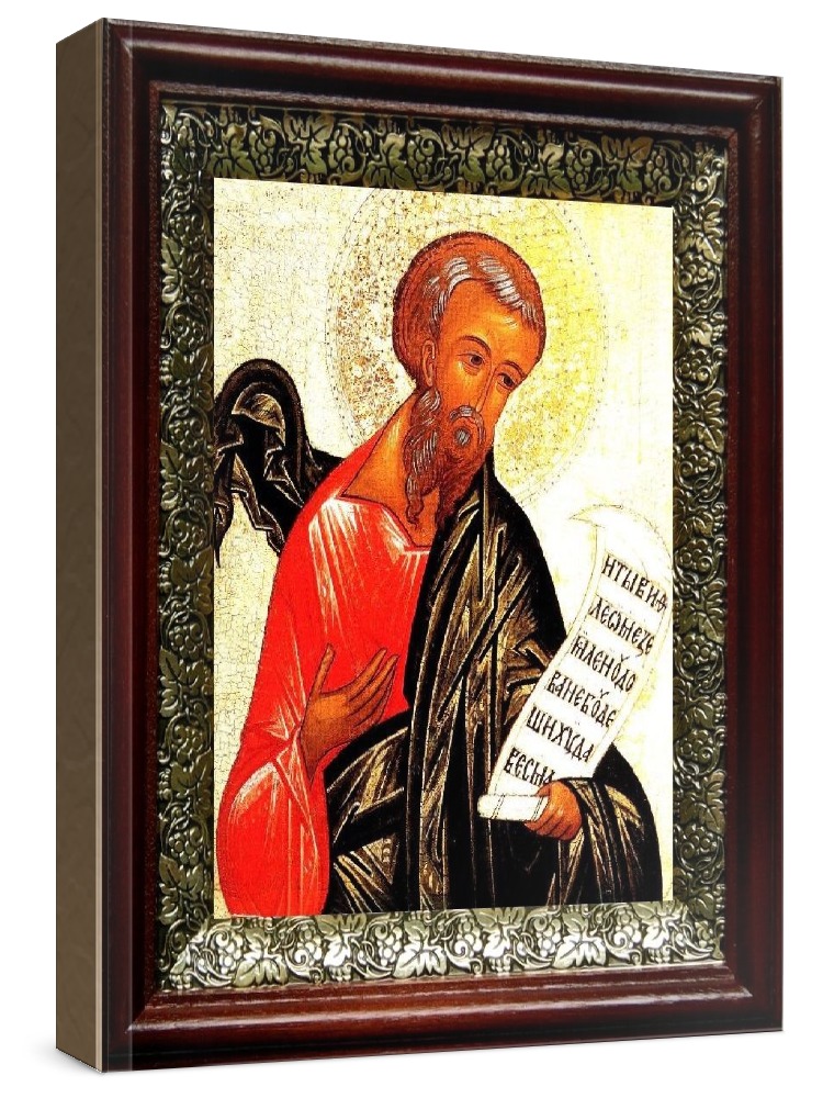 Икона михей, пророк (19х22), темный киот. Лик нанесен методом шелкографии на цельную липовую доску, покрытую левкасом (специальным грунтом под живопись). Использованы минеральные (природные) краски. Размер иконы без киота (см): 13х16, с киотом: 19х22. Киот со стеклом, выполнен из березы и украшен басмой (узор из черненой меди в виде виноградной лозы). Икона освящена.