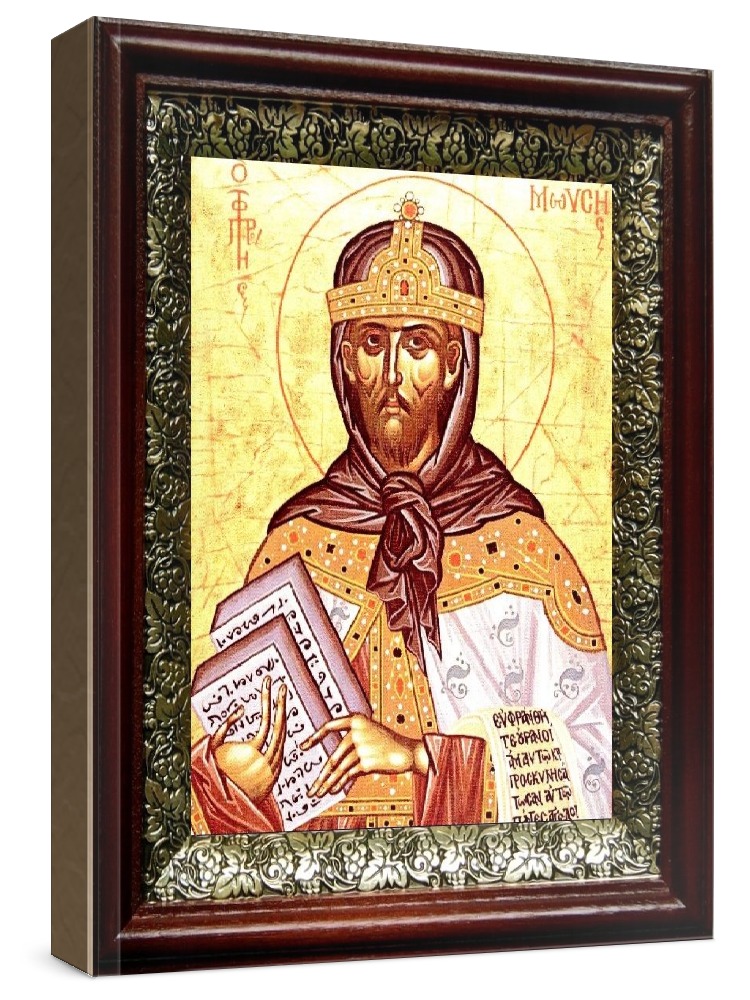 Икона моисей, пророк (19х22), темный киот. Лик нанесен методом шелкографии на цельную липовую доску, покрытую левкасом (специальным грунтом под живопись). Использованы минеральные (природные) краски. Размер иконы без киота (см): 13х16, с киотом: 19х22. Киот со стеклом, выполнен из березы и украшен басмой (узор из черненой меди в виде виноградной лозы). Икона освящена.