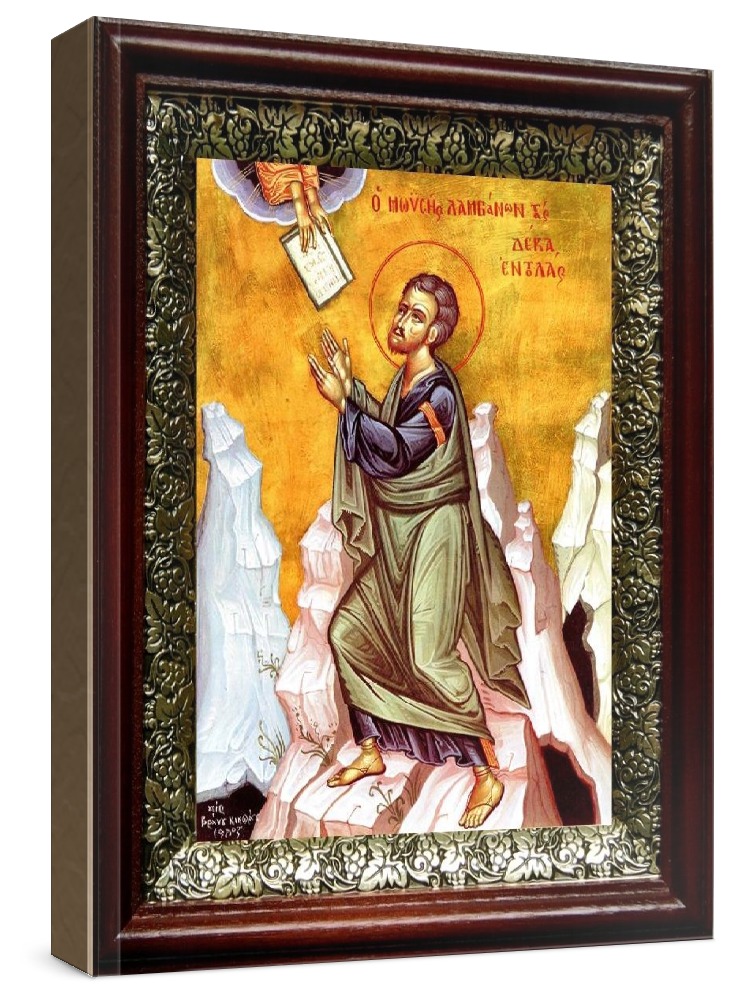 Икона моисей, пророк (19х22), темный киот. Лик нанесен методом шелкографии на цельную липовую доску, покрытую левкасом (специальным грунтом под живопись). Использованы минеральные (природные) краски. Размер иконы без киота (см): 13х16, с киотом: 19х22. Киот со стеклом, выполнен из березы и украшен басмой (узор из черненой меди в виде виноградной лозы). Икона освящена.