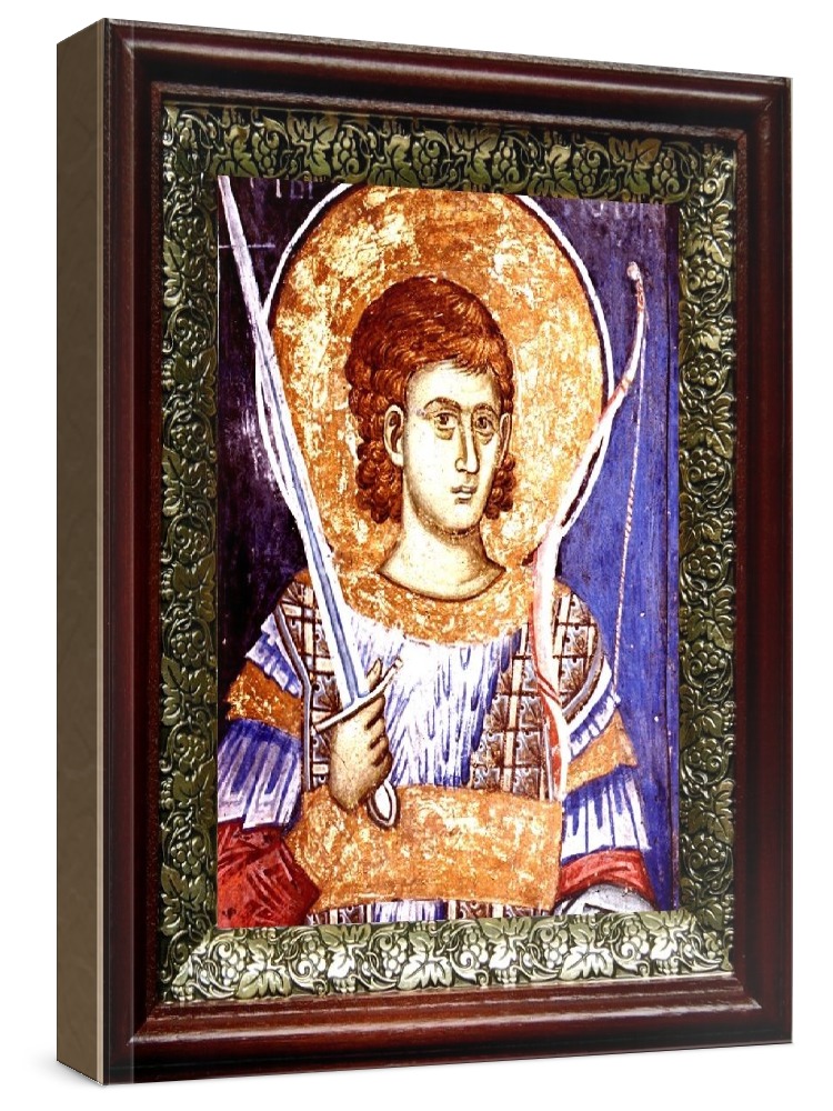 Икона нестор солунский (19х22), темный киот. Лик нанесен методом шелкографии на цельную липовую доску, покрытую левкасом (специальным грунтом под живопись). Использованы минеральные (природные) краски. Размер иконы без киота (см): 13х16, с киотом: 19х22. Киот со стеклом, выполнен из березы и украшен басмой (узор из черненой меди в виде виноградной лозы). Икона освящена.