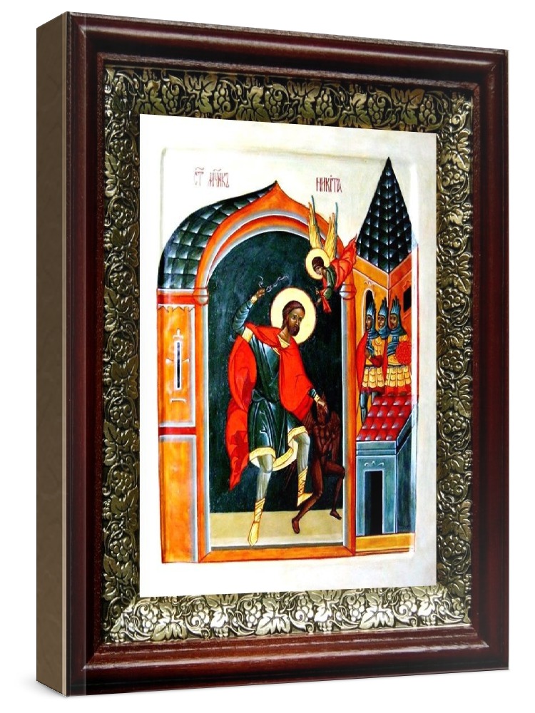 Икона никита бесогон (19х22), темный киот. Лик нанесен методом шелкографии на цельную липовую доску, покрытую левкасом (специальным грунтом под живопись). Использованы минеральные (природные) краски. Размер иконы без киота (см): 13х16, с киотом: 19х22. Киот со стеклом, выполнен из березы и украшен басмой (узор из черненой меди в виде виноградной лозы). Икона освящена.