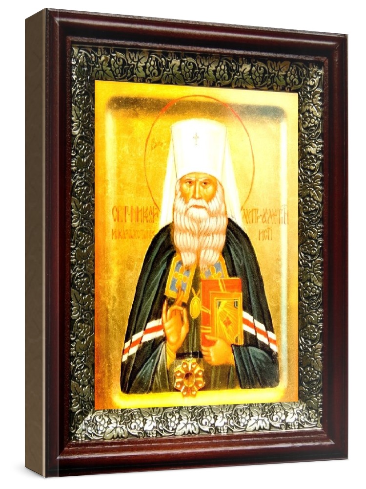 Икона николай алма-атинский (19х22), темный киот. Лик нанесен методом шелкографии на цельную липовую доску, покрытую левкасом (специальным грунтом под живопись). Использованы минеральные (природные) краски. Размер иконы без киота (см): 13х16, с киотом: 19х22. Киот со стеклом, выполнен из березы и украшен басмой (узор из черненой меди в виде виноградной лозы). Икона освящена.