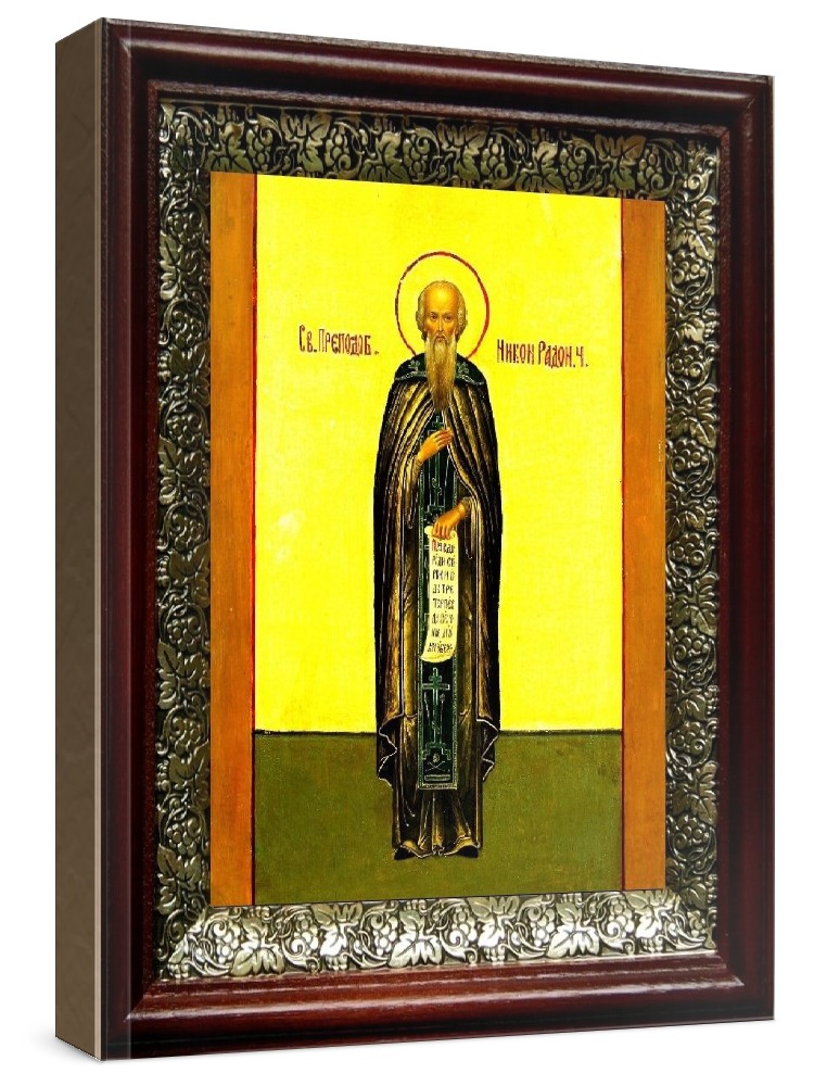 Икона никон радонежский (19х22), темный киот. Лик нанесен методом шелкографии на цельную липовую доску, покрытую левкасом (специальным грунтом под живопись). Использованы минеральные (природные) краски. Размер иконы без киота (см): 13х16, с киотом: 19х22. Киот со стеклом, выполнен из березы и украшен басмой (узор из черненой меди в виде виноградной лозы). Икона освящена.