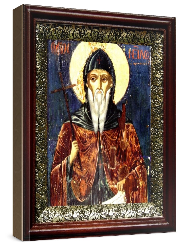 Икона нил мироточивый (19х22), темный киот. Лик нанесен методом шелкографии на цельную липовую доску, покрытую левкасом (специальным грунтом под живопись). Использованы минеральные (природные) краски. Размер иконы без киота (см): 13х16, с киотом: 19х22. Киот со стеклом, выполнен из березы и украшен басмой (узор из черненой меди в виде виноградной лозы). Икона освящена.