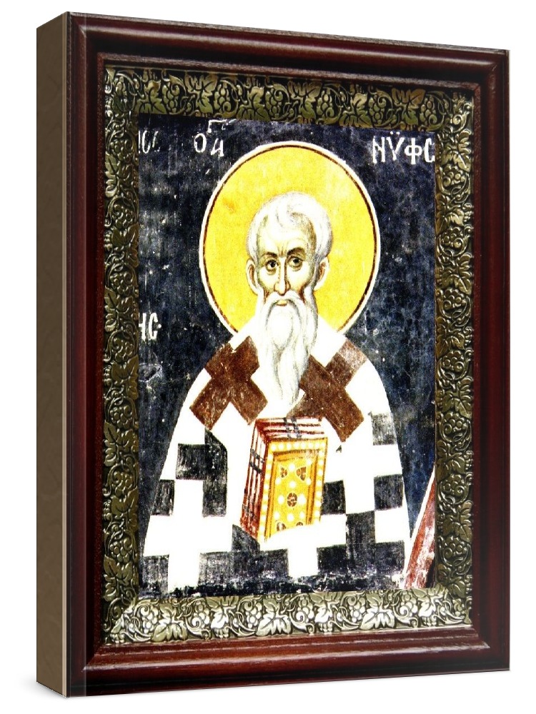 Икона нифонт кипрский (19х22), темный киот. Лик нанесен методом шелкографии на цельную липовую доску, покрытую левкасом (специальным грунтом под живопись). Использованы минеральные (природные) краски. Размер иконы без киота (см): 13х16, с киотом: 19х22. Киот со стеклом, выполнен из березы и украшен басмой (узор из черненой меди в виде виноградной лозы). Икона освящена.