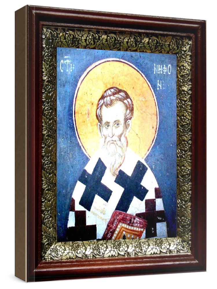 Икона нифонт кипрский (19х22), темный киот.     Лик нанесен методом шелкографии на цельную липовую доску, покрытую левкасом (специальным грунтом под живопись). Использованы минеральные (природные) краски.  Размер иконы без киота (см): 13х16, с киотом: 19х22.  Киот со стеклом, выполнен из березы и украшен басмой (узор из черненой меди в виде виноградной лозы).  Икона освящена.