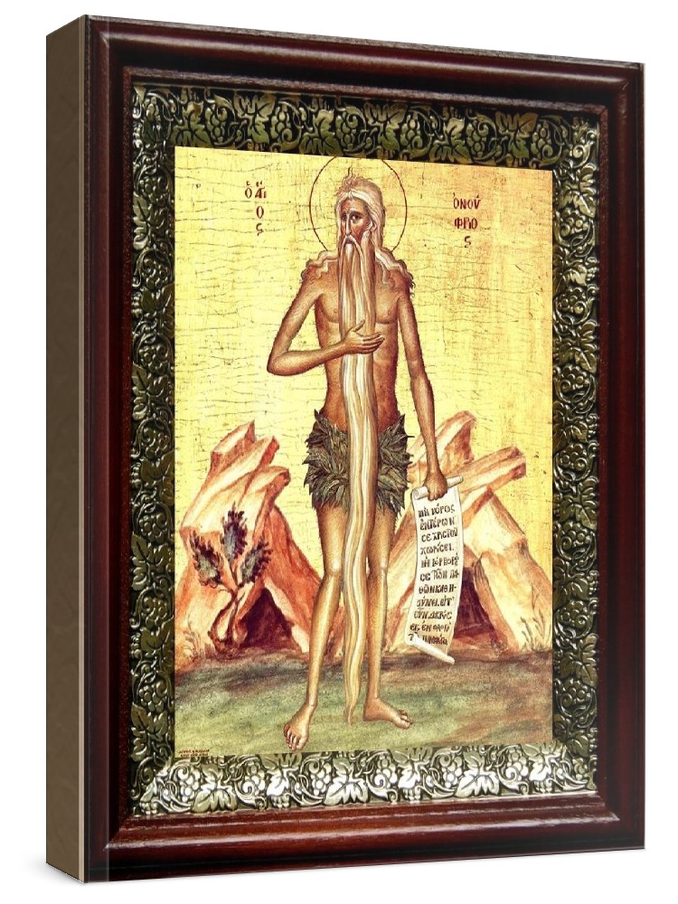 Икона онуфрий великий (19х22), темный киот. Лик нанесен методом шелкографии на цельную липовую доску, покрытую левкасом (специальным грунтом под живопись). Использованы минеральные (природные) краски. Размер иконы без киота (см): 13х16, с киотом: 19х22. Киот со стеклом, выполнен из березы и украшен басмой (узор из черненой меди в виде виноградной лозы). Икона освящена.