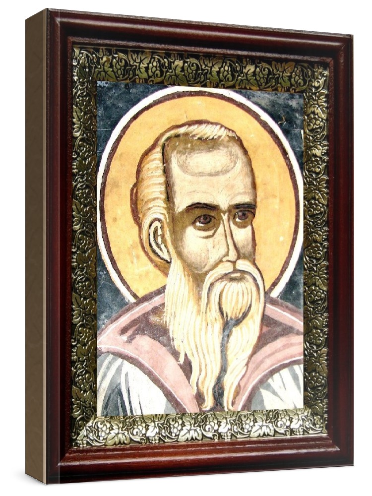 Икона пахомий великий (19х22), темный киот. Лик нанесен методом шелкографии на цельную липовую доску, покрытую левкасом (специальным грунтом под живопись). Использованы минеральные (природные) краски. Размер иконы без киота (см): 13х16, с киотом: 19х22. Киот со стеклом, выполнен из березы и украшен басмой (узор из черненой меди в виде виноградной лозы). Икона освящена.
