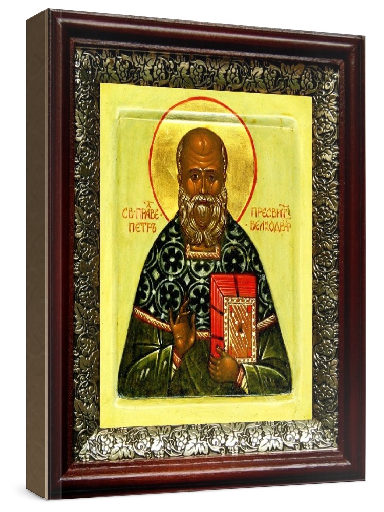 Икона петр великодворский (чельцов) (19х22), темный киот. Лик нанесен методом шелкографии на цельную липовую доску, покрытую левкасом (специальным грунтом под живопись). Использованы минеральные (природные) краски. Размер иконы без киота (см): 13х16, с киотом: 19х22. Киот со стеклом, выполнен из березы и украшен басмой (узор из черненой меди в виде виноградной лозы). Икона освящена.