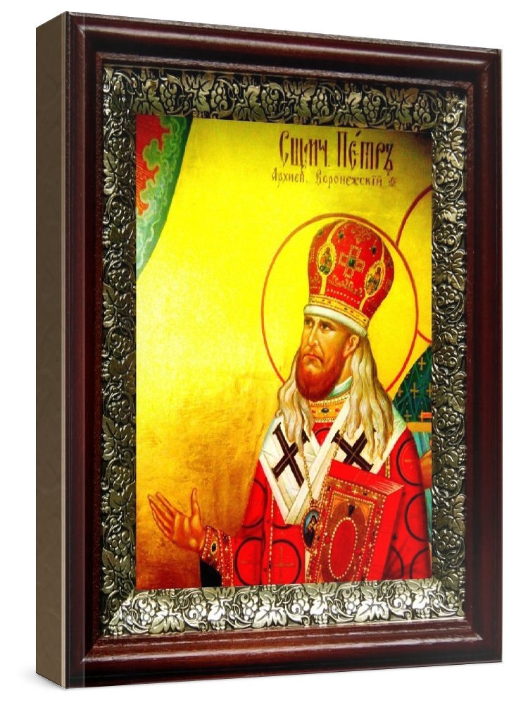 Икона петр воронежский (19х22), темный киот. Лик нанесен методом шелкографии на цельную липовую доску, покрытую левкасом (специальным грунтом под живопись). Использованы минеральные (природные) краски. Размер иконы без киота (см): 13х16, с киотом: 19х22. Киот со стеклом, выполнен из березы и украшен басмой (узор из черненой меди в виде виноградной лозы). Икона освящена.