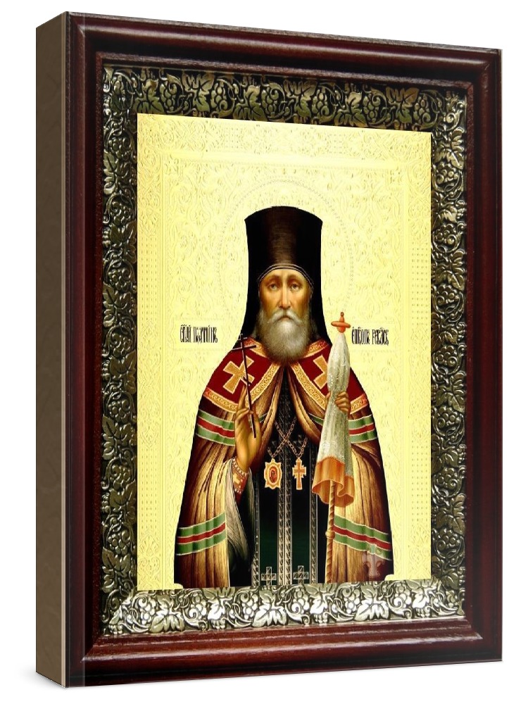 Икона платон ревельский (19х22), темный киот. Лик нанесен методом шелкографии на цельную липовую доску, покрытую левкасом (специальным грунтом под живопись). Использованы минеральные (природные) краски. Размер иконы без киота (см): 13х16, с киотом: 19х22. Киот со стеклом, выполнен из березы и украшен басмой (узор из черненой меди в виде виноградной лозы). Икона освящена.