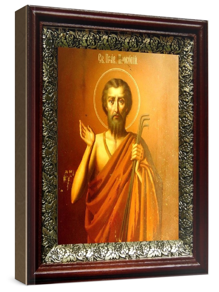 Икона прокопий устюжский (19х22), темный киот. Лик нанесен методом шелкографии на цельную липовую доску, покрытую левкасом (специальным грунтом под живопись). Использованы минеральные (природные) краски. Размер иконы без киота (см): 13х16, с киотом: 19х22. Киот со стеклом, выполнен из березы и украшен басмой (узор из черненой меди в виде виноградной лозы). Икона освящена.