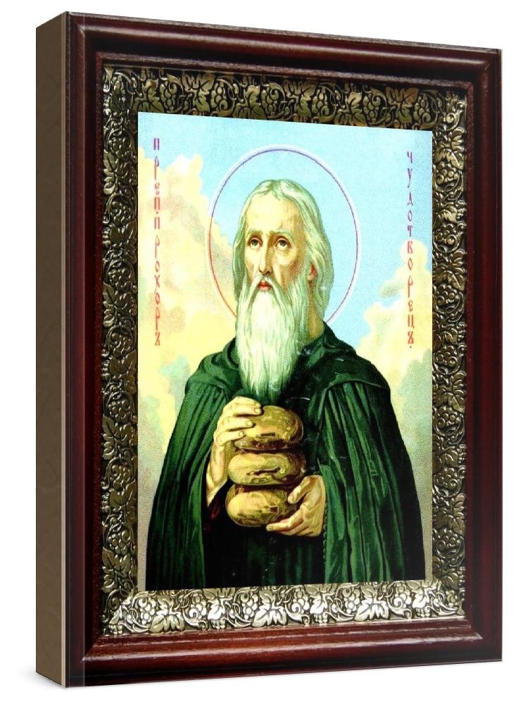 Икона прохор печерский (19х22), темный киот. Лик нанесен методом шелкографии на цельную липовую доску, покрытую левкасом (специальным грунтом под живопись). Использованы минеральные (природные) краски. Размер иконы без киота (см): 13х16, с киотом: 19х22. Киот со стеклом, выполнен из березы и украшен басмой (узор из черненой меди в виде виноградной лозы). Икона освящена.
