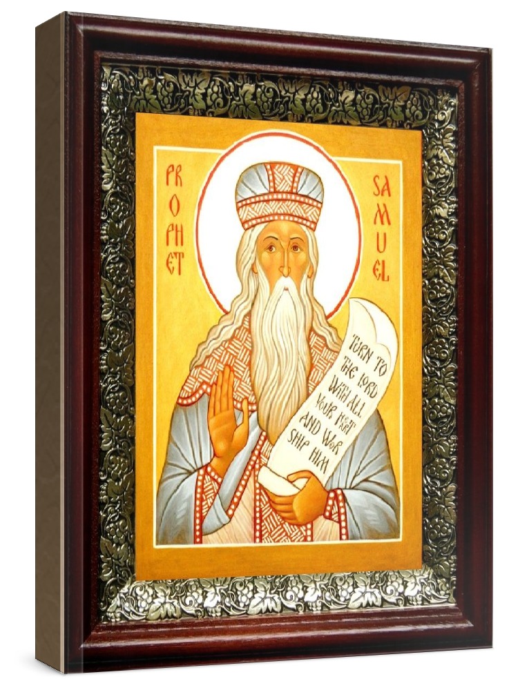 Икона самуил, пророк (19х22), темный киот. Лик нанесен методом шелкографии на цельную липовую доску, покрытую левкасом (специальным грунтом под живопись). Использованы минеральные (природные) краски. Размер иконы без киота (см): 13х16, с киотом: 19х22. Киот со стеклом, выполнен из березы и украшен басмой (узор из черненой меди в виде виноградной лозы). Икона освящена.