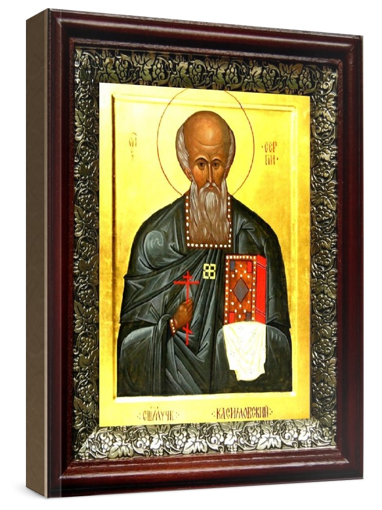 Икона сергий касимовский (19х22), темный киот. Лик нанесен методом шелкографии на цельную липовую доску, покрытую левкасом (специальным грунтом под живопись). Использованы минеральные (природные) краски. Размер иконы без киота (см): 13х16, с киотом: 19х22. Киот со стеклом, выполнен из березы и украшен басмой (узор из черненой меди в виде виноградной лозы). Икона освящена.