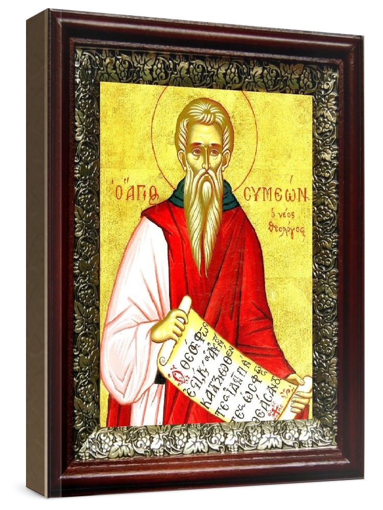 Икона симеон новый богослов (19х22), темный киот. Лик нанесен методом шелкографии на цельную липовую доску, покрытую левкасом (специальным грунтом под живопись). Использованы минеральные (природные) краски. Размер иконы без киота (см): 13х16, с киотом: 19х22. Киот со стеклом, выполнен из березы и украшен басмой (узор из черненой меди в виде виноградной лозы). Икона освящена.