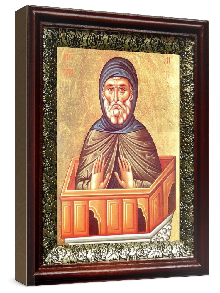 Икона симеон столпник (19х22), темный киот. Лик нанесен методом шелкографии на цельную липовую доску, покрытую левкасом (специальным грунтом под живопись). Использованы минеральные (природные) краски. Размер иконы без киота (см): 13х16, с киотом: 19х22. Киот со стеклом, выполнен из березы и украшен басмой (узор из черненой меди в виде виноградной лозы). Икона освящена.