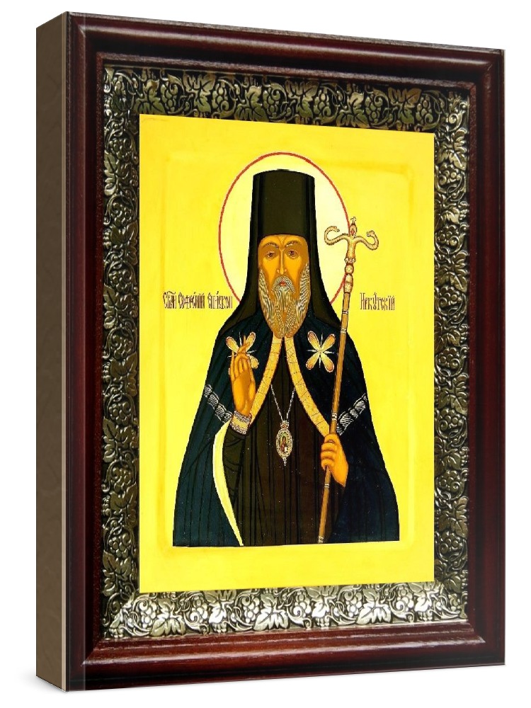 Икона софроний иркутский (19х22), темный киот. Лик нанесен методом шелкографии на цельную липовую доску, покрытую левкасом (специальным грунтом под живопись). Использованы минеральные (природные) краски. Размер иконы без киота (см): 13х16, с киотом: 19х22. Киот со стеклом, выполнен из березы и украшен басмой (узор из черненой меди в виде виноградной лозы). Икона освящена.