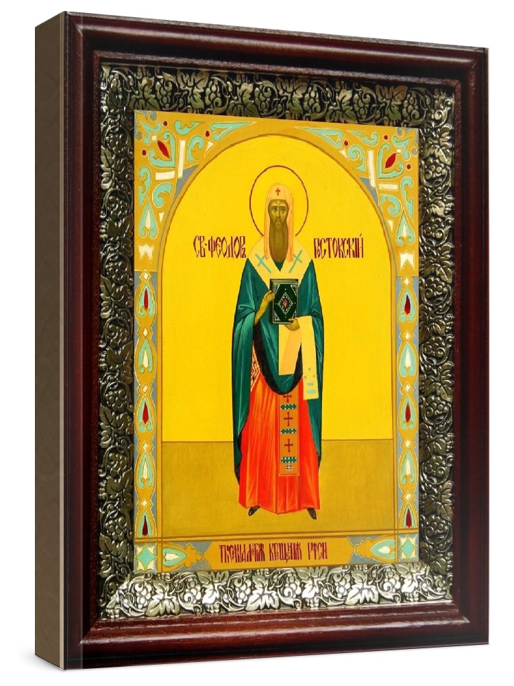 Икона феодор ростовский (19х22), темный киот. Лик нанесен методом шелкографии на цельную липовую доску, покрытую левкасом (специальным грунтом под живопись). Использованы минеральные (природные) краски. Размер иконы без киота (см): 13х16, с киотом: 19х22. Киот со стеклом, выполнен из березы и украшен басмой (узор из черненой меди в виде виноградной лозы). Икона освящена.