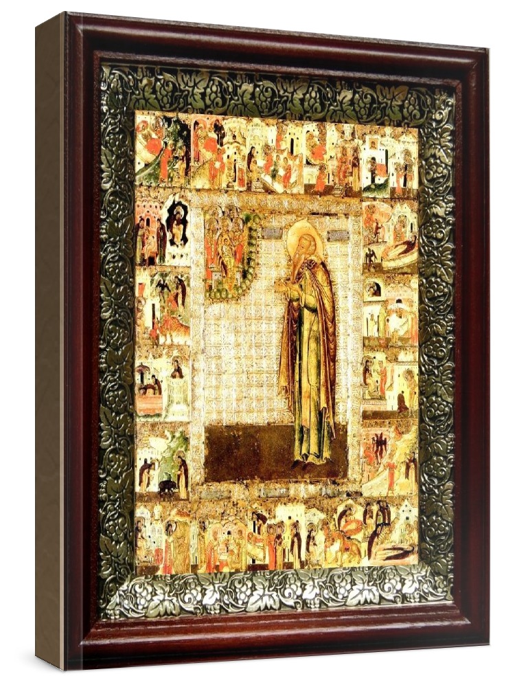 Икона феодор сикеот (19х22), темный киот. Лик нанесен методом шелкографии на цельную липовую доску, покрытую левкасом (специальным грунтом под живопись). Использованы минеральные (природные) краски. Размер иконы без киота (см): 13х16, с киотом: 19х22. Киот со стеклом, выполнен из березы и украшен басмой (узор из черненой меди в виде виноградной лозы). Икона освящена.