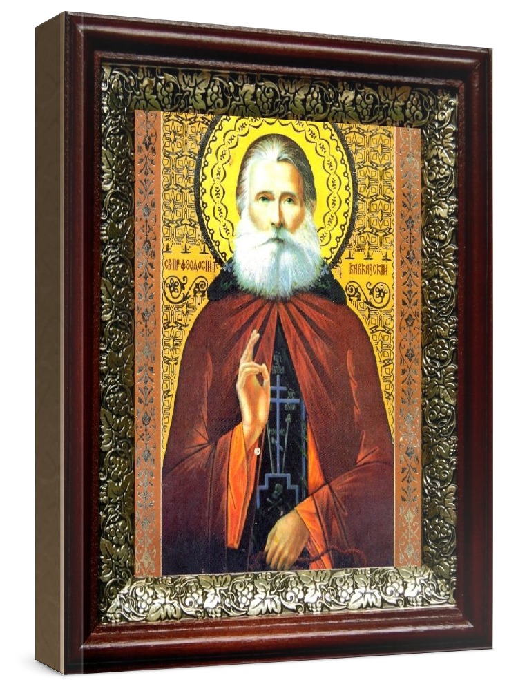 Икона феодосий кавказский (19х22), темный киот. Лик нанесен методом шелкографии на цельную липовую доску, покрытую левкасом (специальным грунтом под живопись). Использованы минеральные (природные) краски. Размер иконы без киота (см): 13х16, с киотом: 19х22. Киот со стеклом, выполнен из березы и украшен басмой (узор из черненой меди в виде виноградной лозы). Икона освящена.