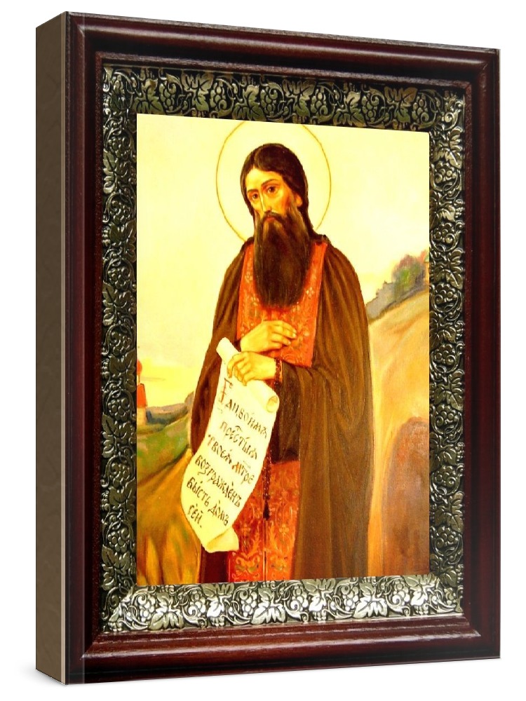 Икона феодосий печерский (19х22), темный киот. Лик нанесен методом шелкографии на цельную липовую доску, покрытую левкасом (специальным грунтом под живопись). Использованы минеральные (природные) краски. Размер иконы без киота (см): 13х16, с киотом: 19х22. Киот со стеклом, выполнен из березы и украшен басмой (узор из черненой меди в виде виноградной лозы). Икона освящена.