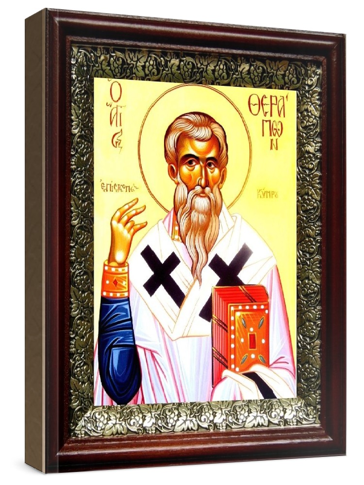 Икона ферапонт кипрский (19х22), темный киот. Лик нанесен методом шелкографии на цельную липовую доску, покрытую левкасом (специальным грунтом под живопись). Использованы минеральные (природные) краски. Размер иконы без киота (см): 13х16, с киотом: 19х22. Киот со стеклом, выполнен из березы и украшен басмой (узор из черненой меди в виде виноградной лозы). Икона освящена.
