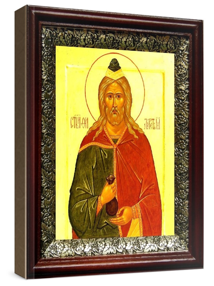 Икона филарет милостивый (19х22), темный киот. Лик нанесен методом шелкографии на цельную липовую доску, покрытую левкасом (специальным грунтом под живопись). Использованы минеральные (природные) краски. Размер иконы без киота (см): 13х16, с киотом: 19х22. Киот со стеклом, выполнен из березы и украшен басмой (узор из черненой меди в виде виноградной лозы). Икона освящена.