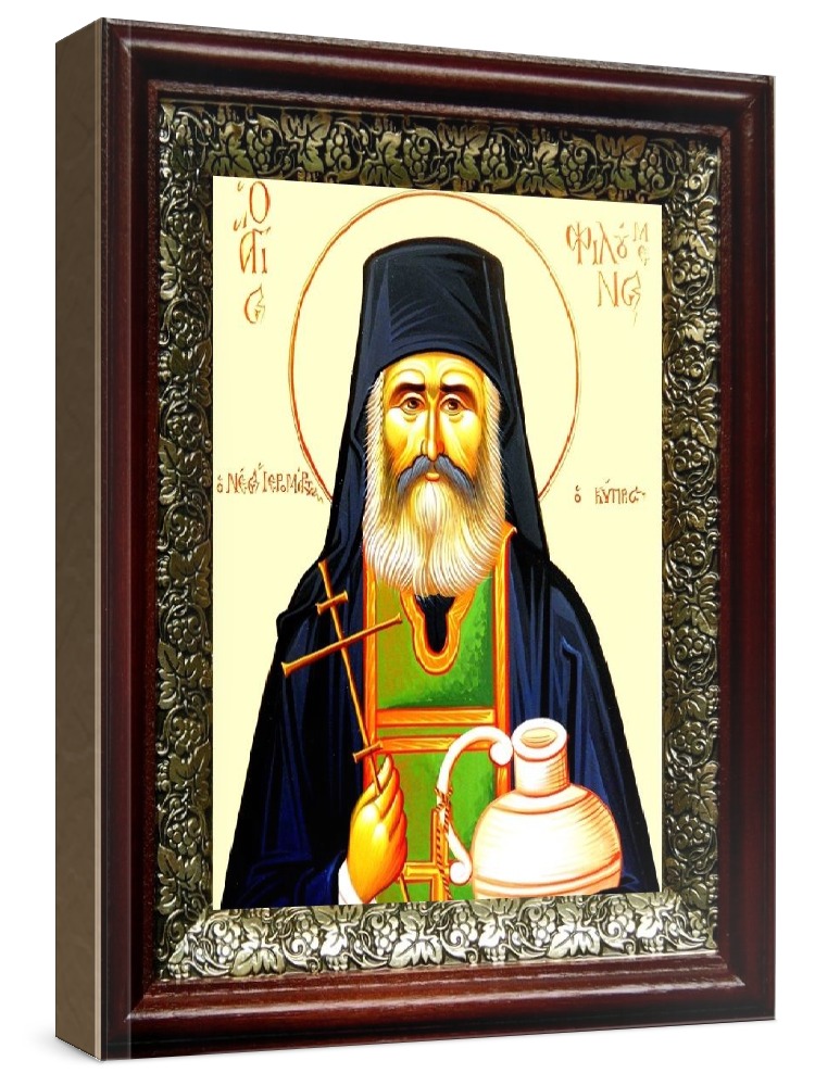 Икона филумен палестинский (19х22), темный киот. Лик нанесен методом шелкографии на цельную липовую доску, покрытую левкасом (специальным грунтом под живопись). Использованы минеральные (природные) краски. Размер иконы без киота (см): 13х16, с киотом: 19х22. Киот со стеклом, выполнен из березы и украшен басмой (узор из черненой меди в виде виноградной лозы). Икона освящена.
