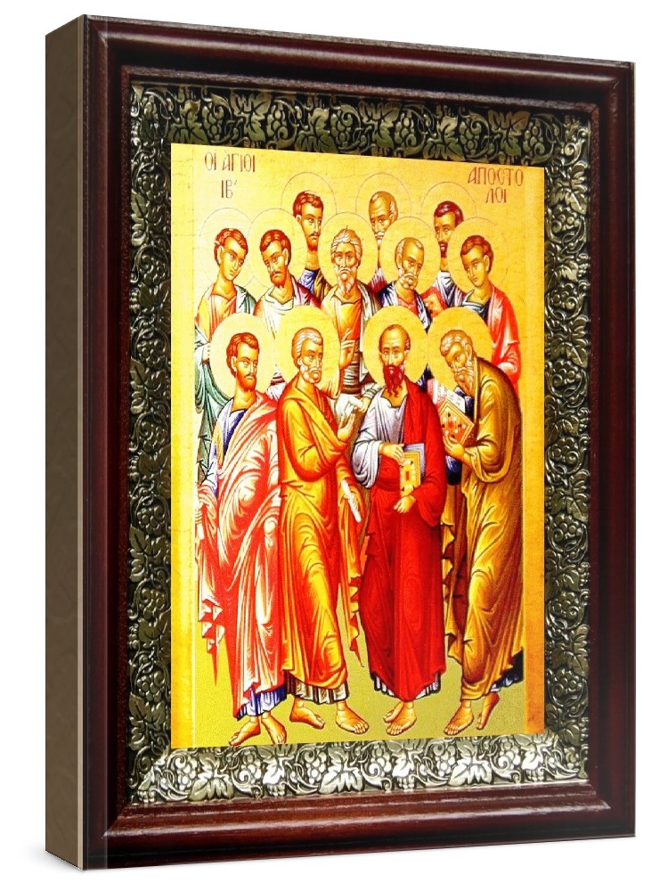 Икона 12 апостолов (19х22), темный киот. Лик нанесен методом шелкографии на цельную липовую доску, покрытую левкасом (специальным грунтом под живопись). Использованы минеральные (природные) краски. Размер иконы без киота (см): 13х16, с киотом: 19х22. Киот со стеклом, выполнен из березы и украшен басмой (узор из черненой меди в виде виноградной лозы). Икона освящена.