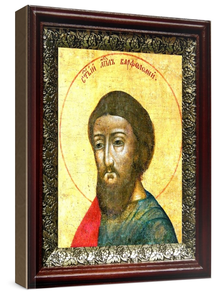 Икона апостол варфоломей (19х22), темный киот. Лик нанесен методом шелкографии на цельную липовую доску, покрытую левкасом (специальным грунтом под живопись). Использованы минеральные (природные) краски. Размер иконы без киота (см): 13х16, с киотом: 19х22. Киот со стеклом, выполнен из березы и украшен басмой (узор из черненой меди в виде виноградной лозы). Икона освящена.