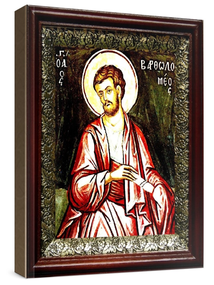Икона апостол варфоломей (19х22), темный киот.     Лик нанесен методом шелкографии на цельную липовую доску, покрытую левкасом (специальным грунтом под живопись). Использованы минеральные (природные) краски.  Размер иконы без киота (см): 13х16, с киотом: 19х22.  Киот со стеклом, выполнен из березы и украшен басмой (узор из черненой меди в виде виноградной лозы).  Икона освящена.