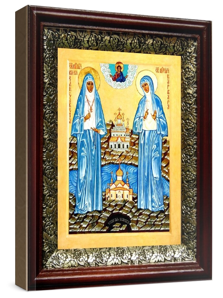 Икона елизавета и варвара (19х22), темный киот. Лик нанесен методом шелкографии на цельную липовую доску, покрытую левкасом (специальным грунтом под живопись). Использованы минеральные (природные) краски. Размер иконы без киота (см): 13х16, с киотом: 19х22. Киот со стеклом, выполнен из березы и украшен басмой (узор из черненой меди в виде виноградной лозы). Икона освящена.