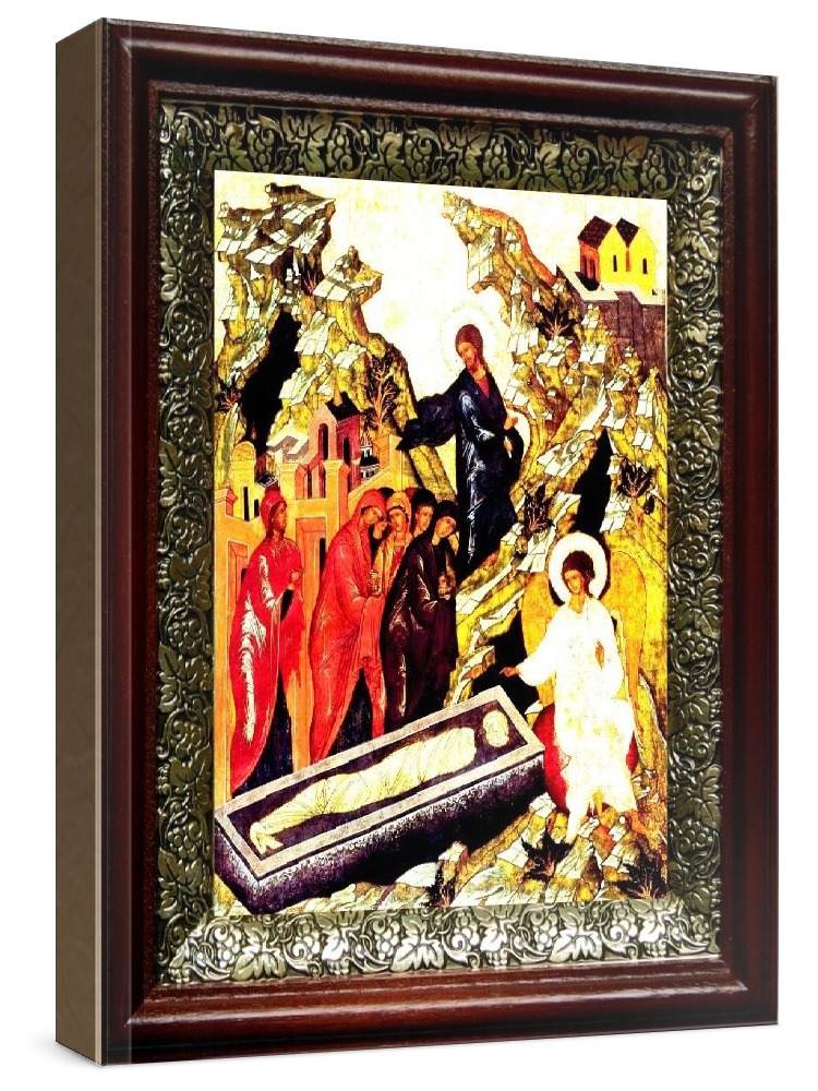 Икона жены мироносицы (19х22), темный киот. Лик нанесен методом шелкографии на цельную липовую доску, покрытую левкасом (специальным грунтом под живопись). Использованы минеральные (природные) краски. Размер иконы без киота (см): 13х16, с киотом: 19х22. Киот со стеклом, выполнен из березы и украшен басмой (узор из черненой меди в виде виноградной лозы). Икона освящена.