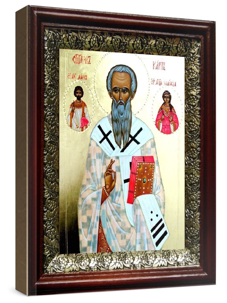 Икона карп, апостол от 70-ти (19х22), темный киот. Лик нанесен методом шелкографии на цельную липовую доску, покрытую левкасом (специальным грунтом под живопись). Использованы минеральные (природные) краски. Размер иконы без киота (см): 13х16, с киотом: 19х22. Киот со стеклом, выполнен из березы и украшен басмой (узор из черненой меди в виде виноградной лозы). Икона освящена.